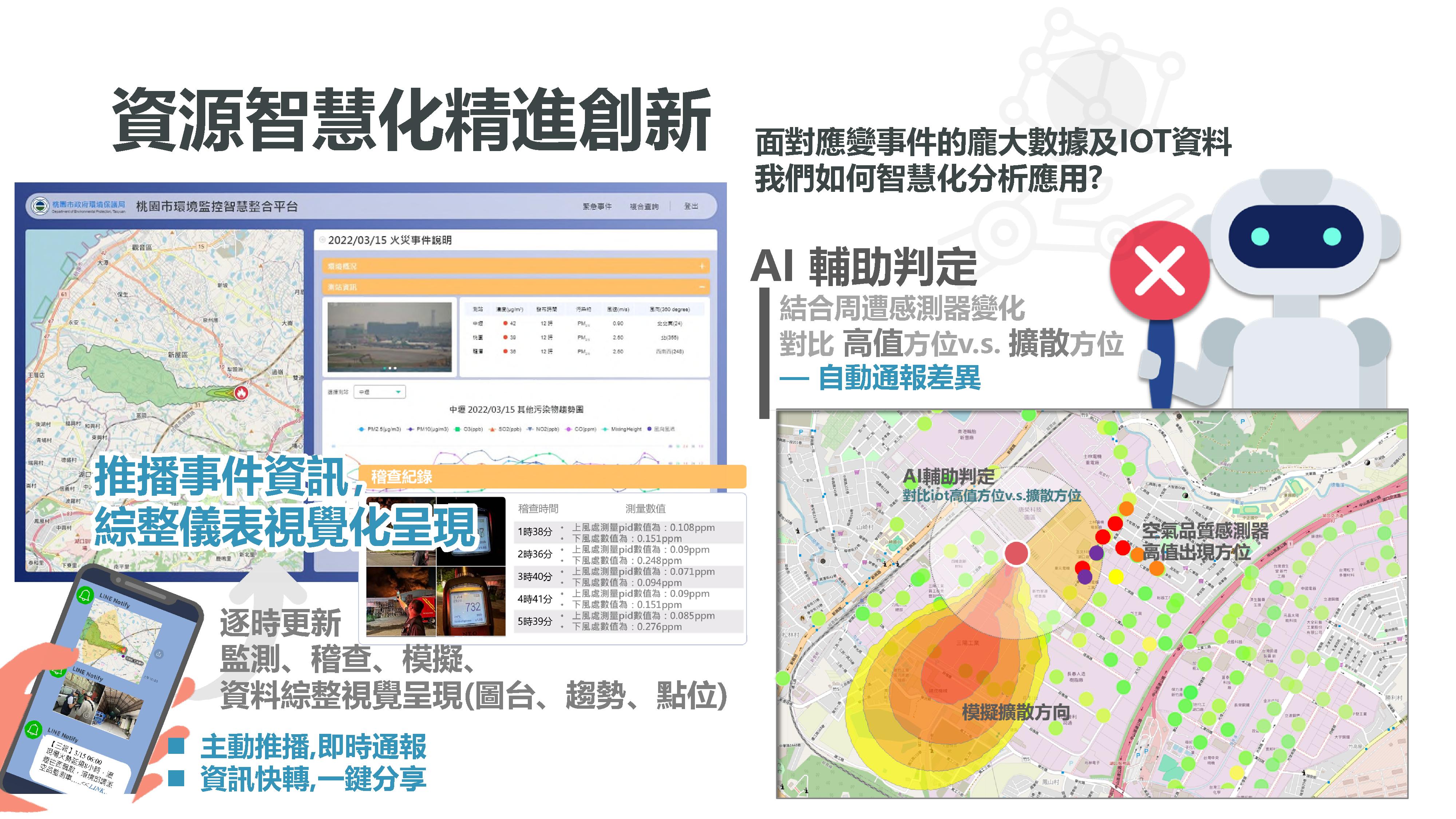 顏己喨局長進一步指出,桃園擁有12座列管工業區,長期以來工業區偷排廢污水事件屢見不鮮,以往以人力進行溯源稽查時,常因污染稍縱即逝,耗時耗力仍無所獲。為解決困境,環保局推動「科技物聯網應用於工業區水污染防治計畫」,在工業區設置雨水道水質感測器及監視器,實現水污染即時監控。不僅裁處告發率提升10%,也減少了50%稽查人力,大幅提升作業效率。此外,顏局長也強調,有效運用龐大的環境監測數據,確保環境監測數據和信息能夠有效整合,是未來的重要挑戰,因此透過「桃園市環境監測數據整合計畫」將環境品質資訊網及資訊管理平台建置後,環境監測數據的整合分析與環境資訊的透明公開,都將為市民的居住環境更縝密的把關。這2個提案獲得市府創新提案點子獎殊榮,也是環保局在智慧環境治理上的重要突破。